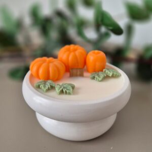 De vrolijke pompoentjes en herfstblaadjes bovenop zijn zorgvuldig gevormd uit was en geven de kaars die typische gezellige herfstlook. Het potje is handgemaakt van giethars, afgewerkt met een beschermende laklaag voor een duurzame, stijlvolle afwerking.